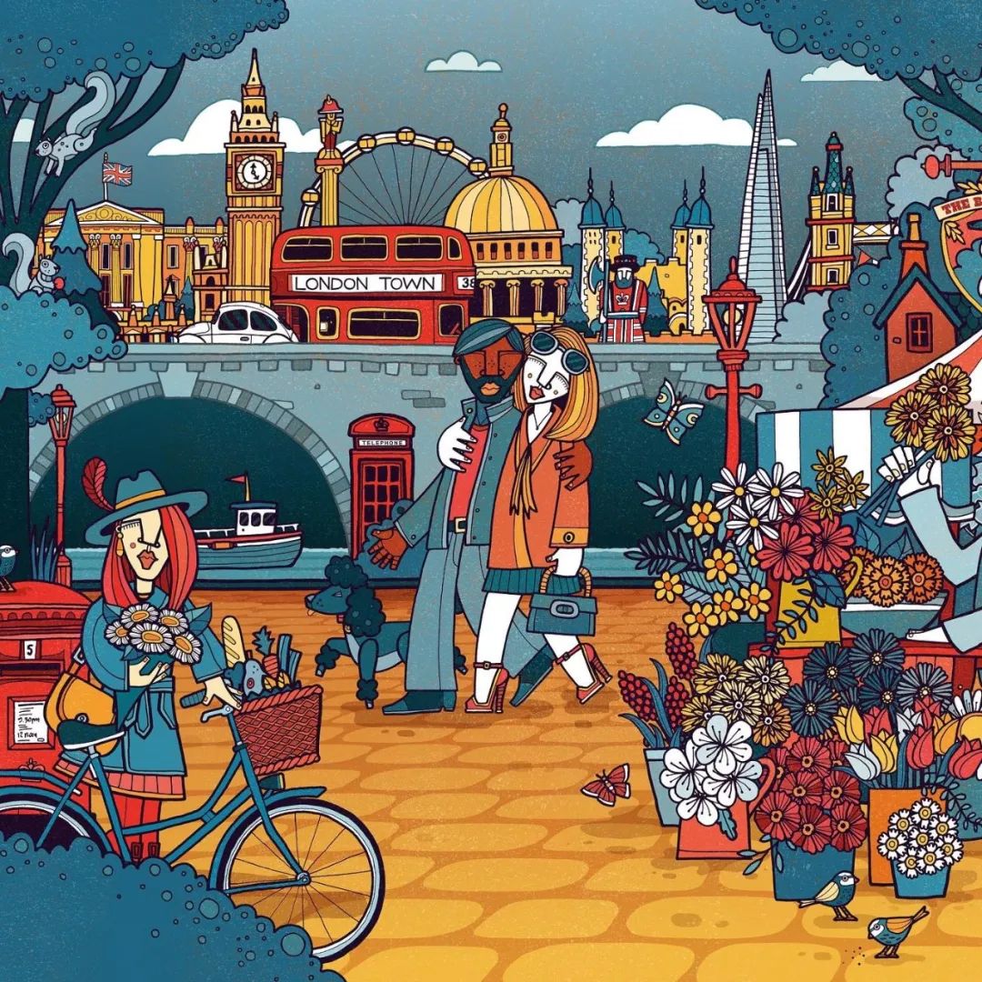 以上是另一组为唐宁茶设计的包装画面,以伦敦为背景,用缤纷的色彩和元素,描绘了最具代表性的伦敦风光。大笨钟、伦敦桥、白金汉宫、观光巴士,包装上的视觉演绎,令唐宁茶的起始地背景伦敦,跨洋过海来到了唐宁茶的消费者手中。